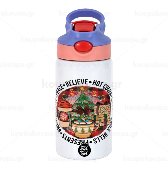 Joy, Peace, Believe, Hot Cocoa, Carols, Children's hot water bottle, stainless steel, with safety straw, pink/purple (350ml)