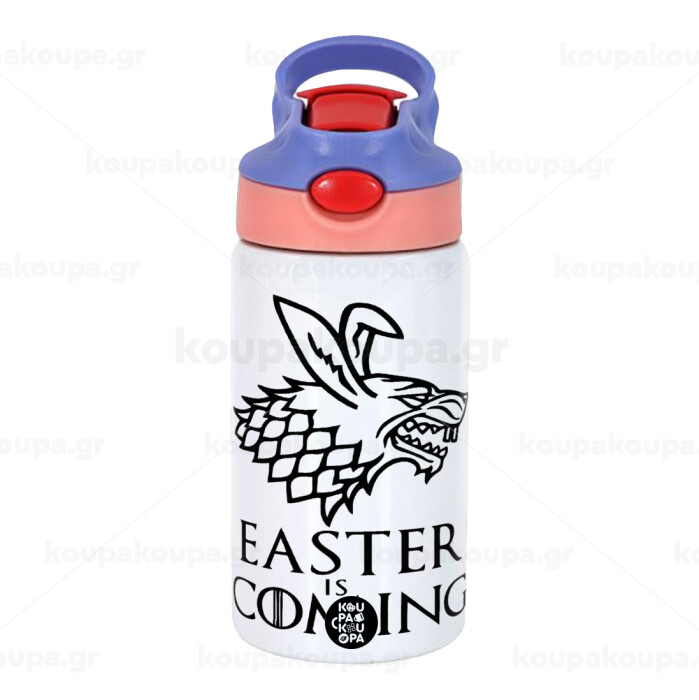 Easter is coming (GOT), Children's hot water bottle, stainless steel, with safety straw, pink/purple (350ml)