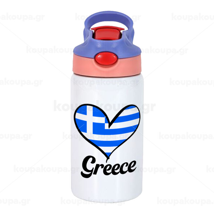 Greece flag, Children's hot water bottle, stainless steel, with safety straw, pink/purple (350ml)