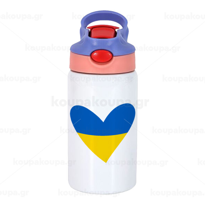 UKRAINE heart, Children's hot water bottle, stainless steel, with safety straw, pink/purple (350ml)