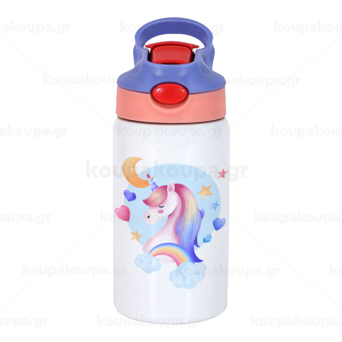 Cute unicorn, Children's hot water bottle, stainless steel, with safety straw, pink/purple (350ml)