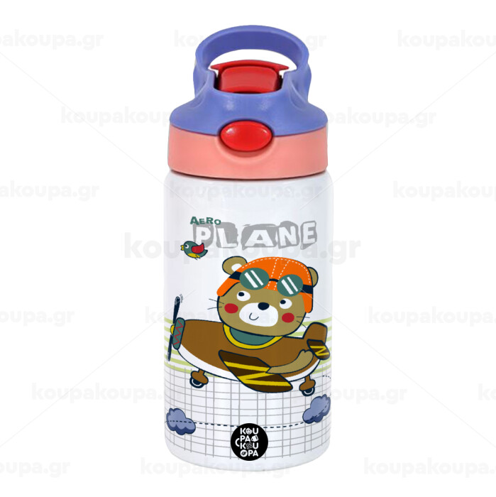 Kids Plane, Children's hot water bottle, stainless steel, with safety straw, pink/purple (350ml)