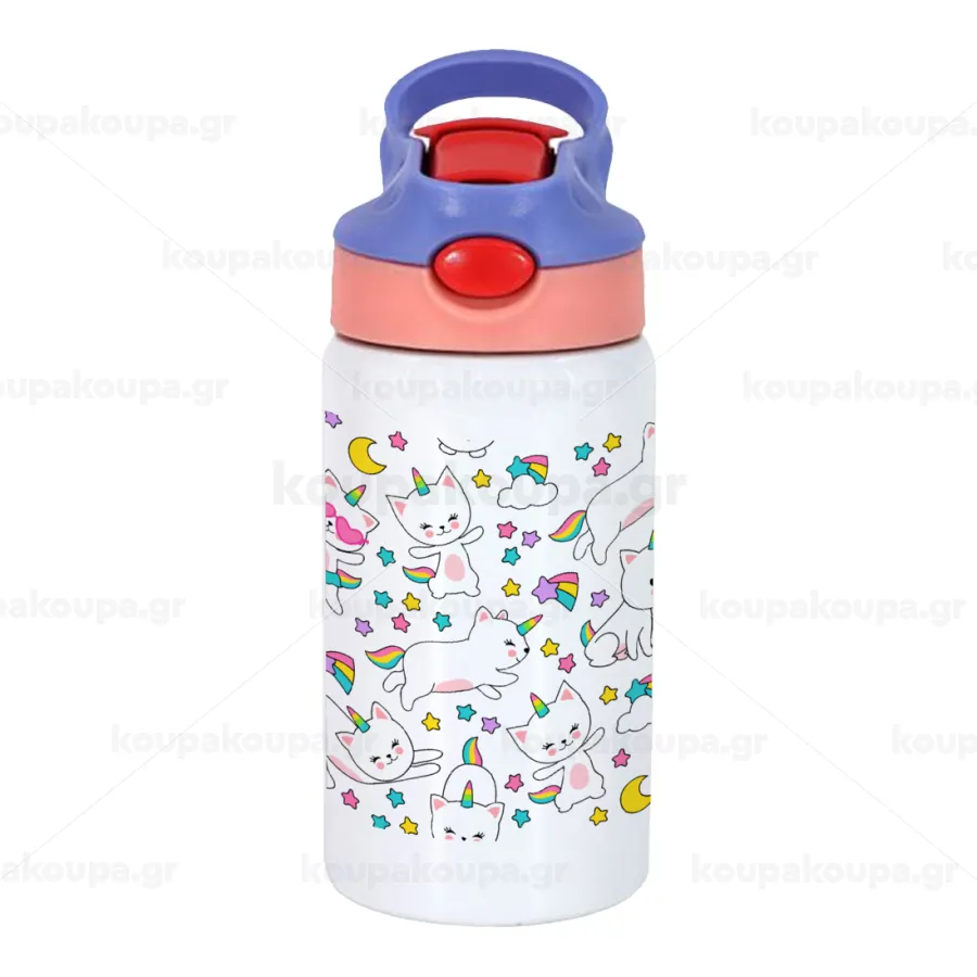 Cats unicorns, Children's hot water bottle, stainless steel, with safety straw, pink/purple (350ml)
