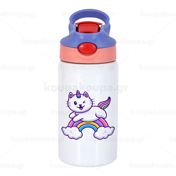 Cute cat unicorn, Children's hot water bottle, stainless steel, with safety straw, pink/purple (350ml)