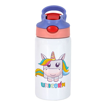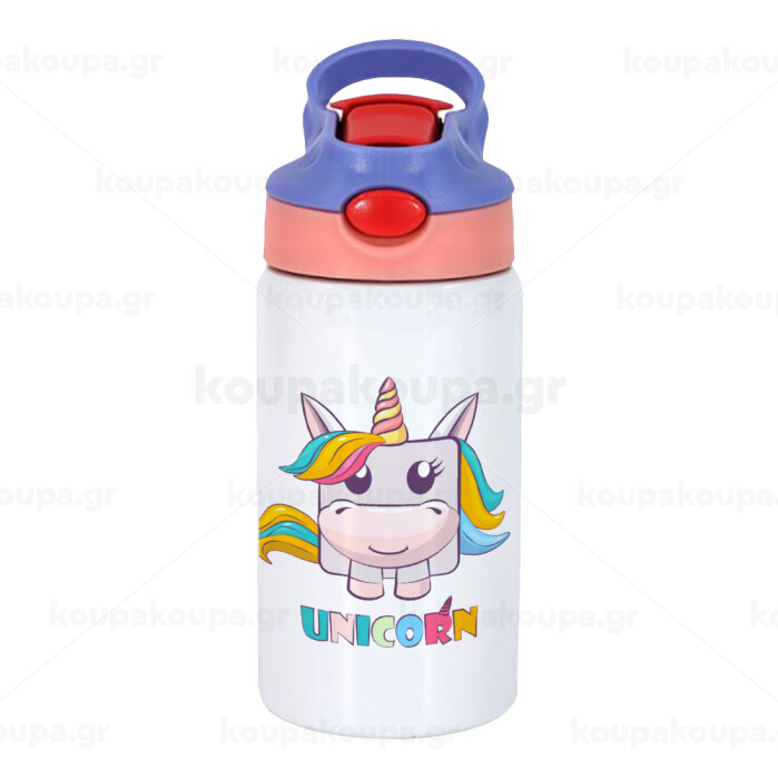 Unicorns cube, Children's hot water bottle, stainless steel, with safety straw, pink/purple (350ml)