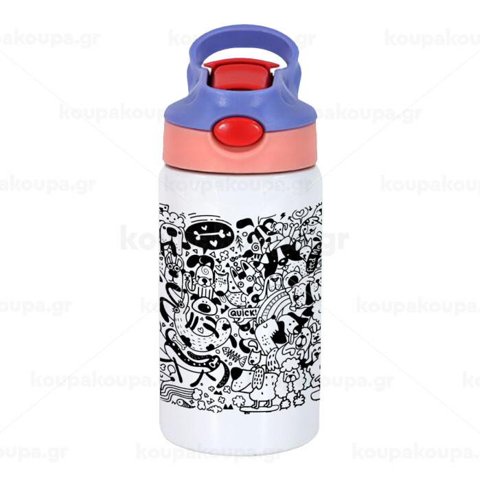 DOG pattern, Children's hot water bottle, stainless steel, with safety straw, pink/purple (350ml)