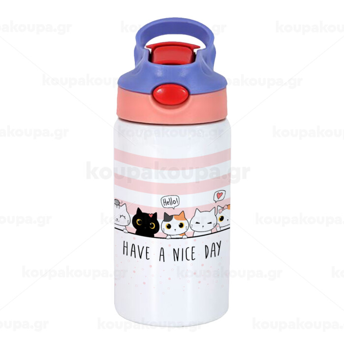 Have a nice day cats, Children's hot water bottle, stainless steel, with safety straw, pink/purple (350ml)