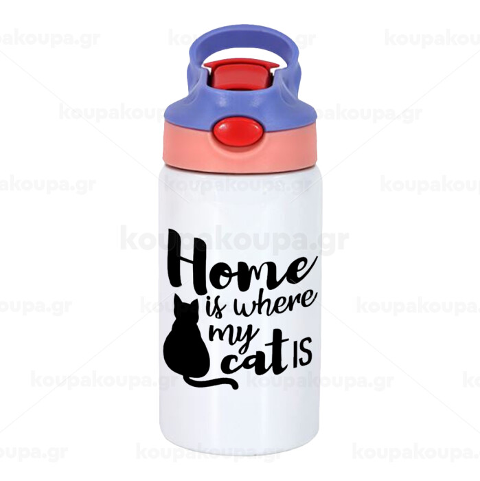 Home is where my cat is!, Children's hot water bottle, stainless steel, with safety straw, pink/purple (350ml)