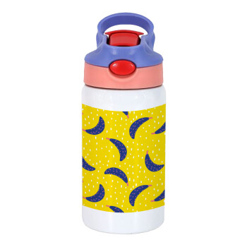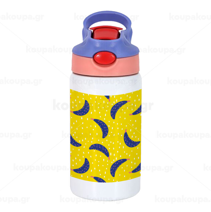 Yellow seamless with blue bananas, Children's hot water bottle, stainless steel, with safety straw, pink/purple (350ml)