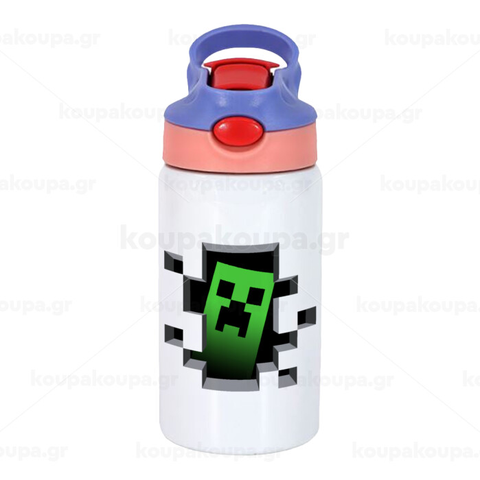 Minecraft creeper, Children's hot water bottle, stainless steel, with safety straw, pink/purple (350ml)
