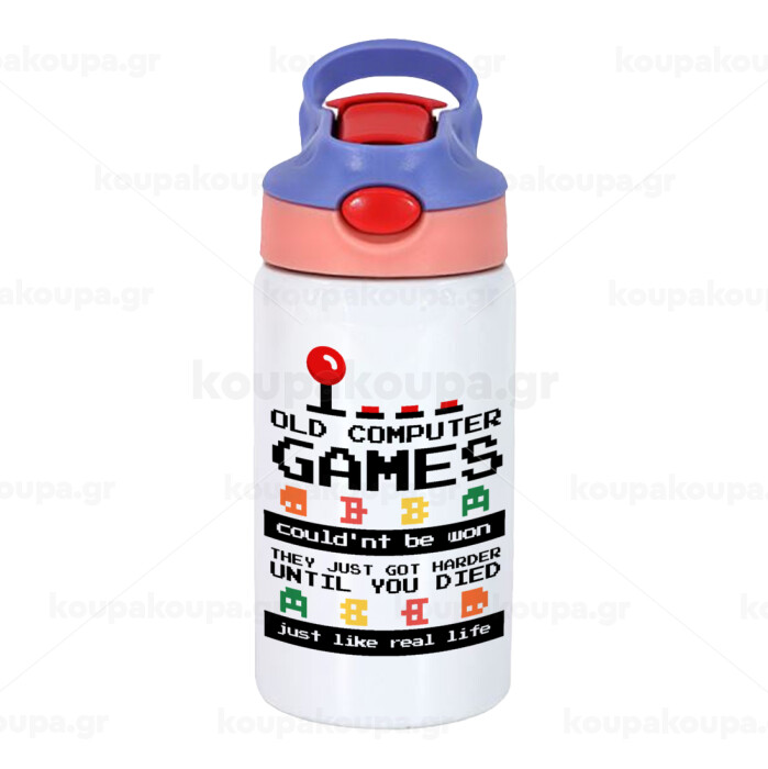 OLD computer games couldn't be won just like real life!, Children's hot water bottle, stainless steel, with safety straw, pink/purple (350ml)