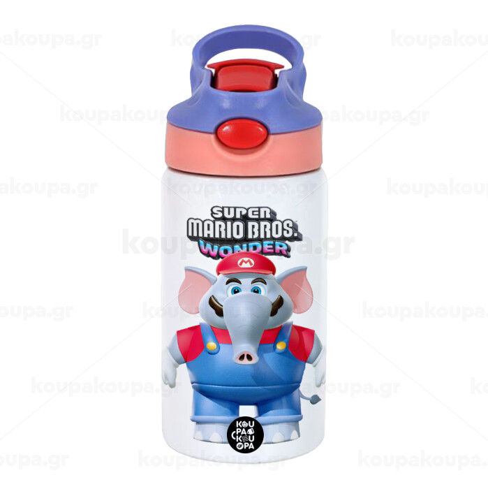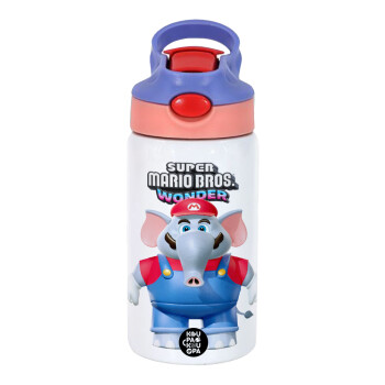 Super mario wonder, Children's hot water bottle, stainless steel, with safety straw, pink/purple (350ml)