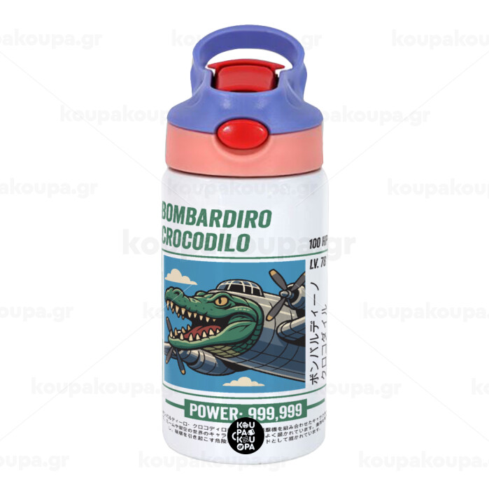 Bombardiro Crocodilo, Children's hot water bottle, stainless steel, with safety straw, pink/purple (350ml)