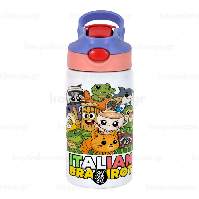 Italian Brainrot friends, Children's hot water bottle, stainless steel, with safety straw, pink/purple (350ml)