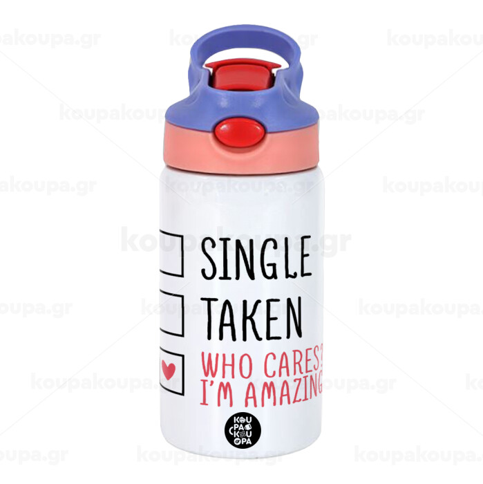 Single, Taken, Who cares i'm amazing, Children's hot water bottle, stainless steel, with safety straw, pink/purple (350ml)