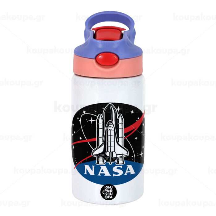 NASA Badge, Children's hot water bottle, stainless steel, with safety straw, pink/purple (350ml)