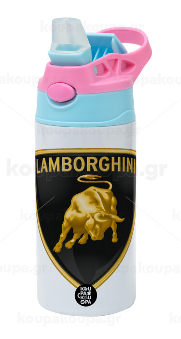 Lamborghini, Children's hot water bottle, stainless steel, with safety straw, Pink/BlueCiel (360ml) BPA FREE