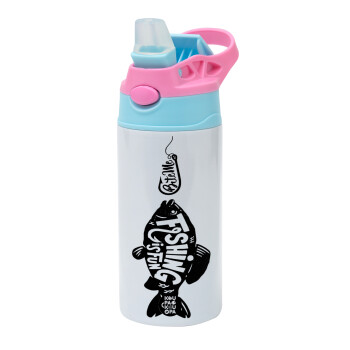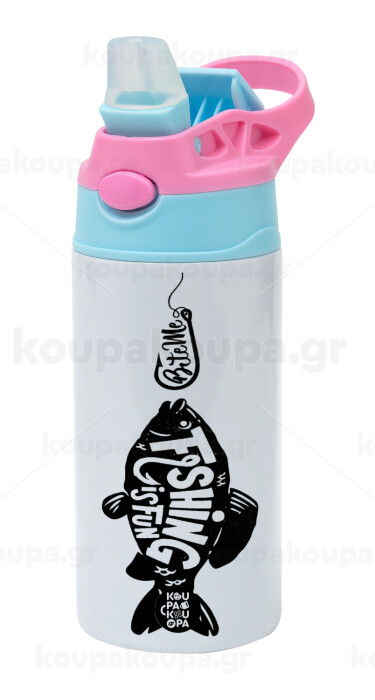Fishing is fun, Children's hot water bottle, stainless steel, with safety straw, Pink/BlueCiel (360ml) BPA FREE