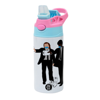 Pulp Fiction 3 meter away, Children's hot water bottle, stainless steel, with safety straw, Pink/BlueCiel (360ml) BPA FREE