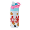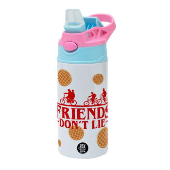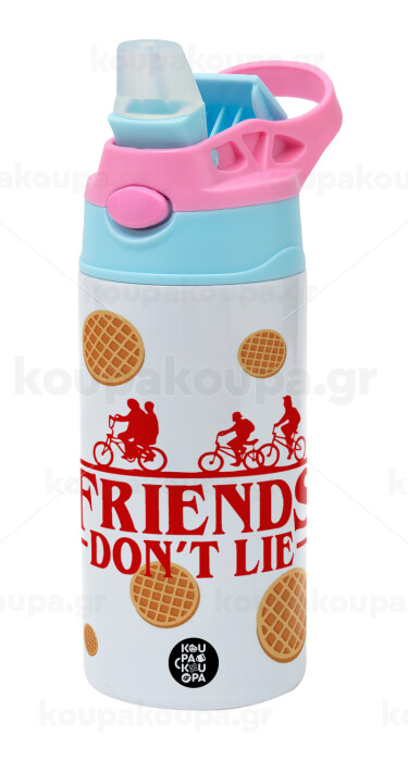 Friends Don't Lie, Stranger Things, Children's hot water bottle, stainless steel, with safety straw, Pink/BlueCiel (360ml) BPA FREE