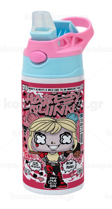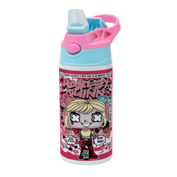 Harley Quinn (Χάρλεϊ Κουίν), Children's hot water bottle, stainless steel, with safety straw, Pink/BlueCiel (360ml) BPA FREE