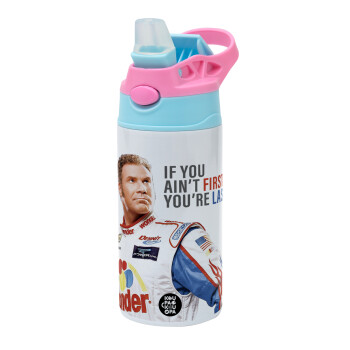 If You Ain't First You're Last Ricky Bobby, Talladega Nights, Children's hot water bottle, stainless steel, with safety straw, Pink/BlueCiel (360ml) BPA FREE