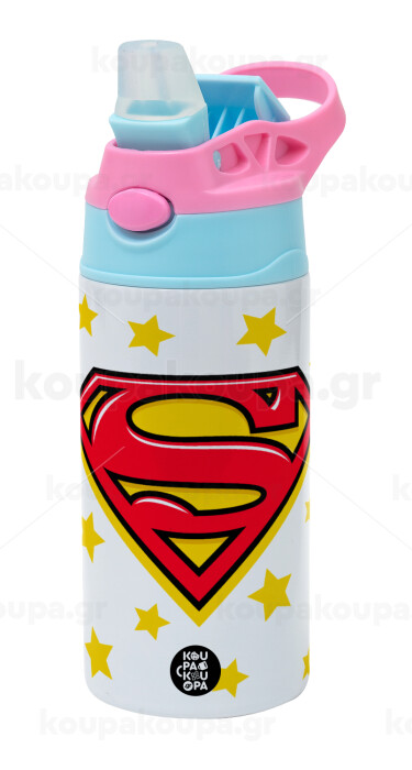 Superman Blue, Children's hot water bottle, stainless steel, with safety straw, Pink/BlueCiel (360ml) BPA FREE