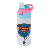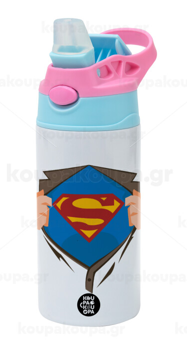 Superman hands, Children's hot water bottle, stainless steel, with safety straw, Pink/BlueCiel (360ml) BPA FREE