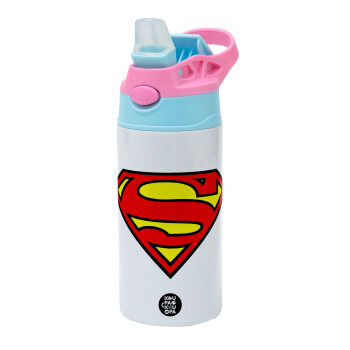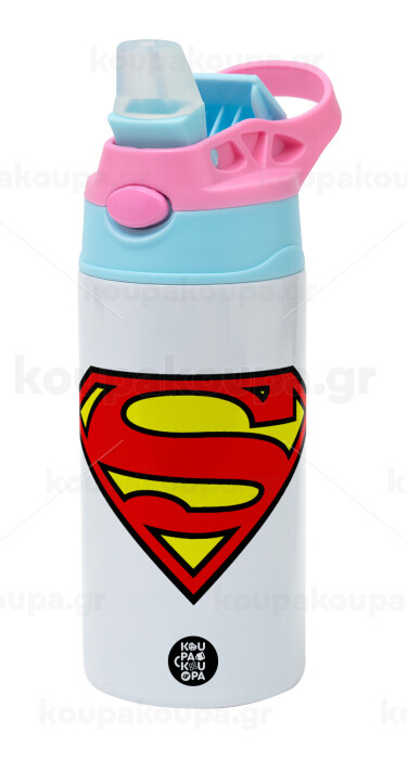 Superman vintage, Children's hot water bottle, stainless steel, with safety straw, Pink/BlueCiel (360ml) BPA FREE