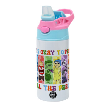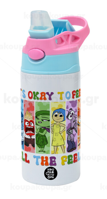 Inside Out It's Okay To Feel All The Feels , Children's hot water bottle, stainless steel, with safety straw, Pink/BlueCiel (360ml) BPA FREE