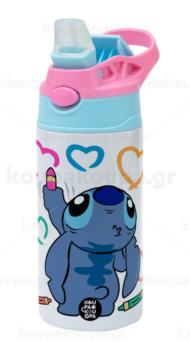 Lilo & Stitch painting, Children's hot water bottle, stainless steel, with safety straw, Pink/BlueCiel (360ml) BPA FREE
