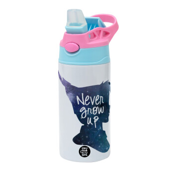 Never Grow UP, Children's hot water bottle, stainless steel, with safety straw, Pink/BlueCiel (360ml) BPA FREE