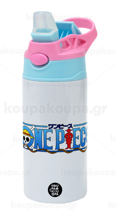 Onepiece logo, Children's hot water bottle, stainless steel, with safety straw, Pink/BlueCiel (360ml) BPA FREE