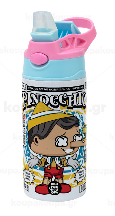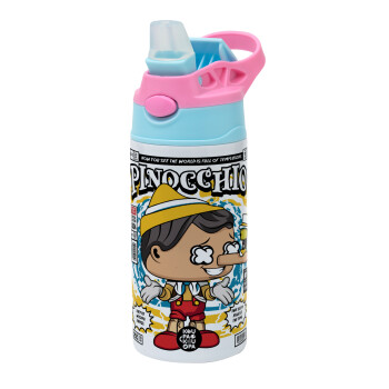 Pinocchio, Children's hot water bottle, stainless steel, with safety straw, Pink/BlueCiel (360ml) BPA FREE