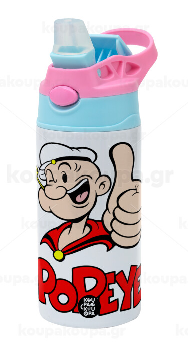 Popeye the sailor man, Children's hot water bottle, stainless steel, with safety straw, Pink/BlueCiel (360ml) BPA FREE