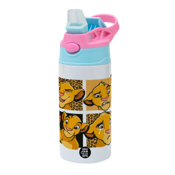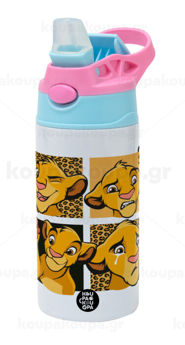 Simba, lion king, Children's hot water bottle, stainless steel, with safety straw, Pink/BlueCiel (360ml) BPA FREE