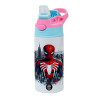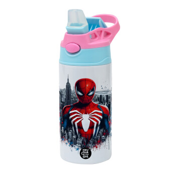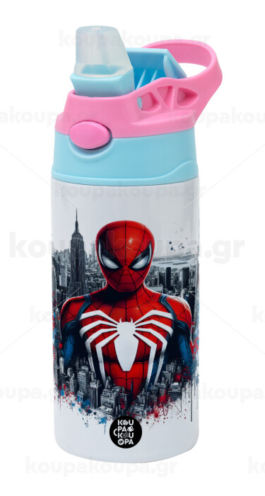 Spiderman City, Children's hot water bottle, stainless steel, with safety straw, Pink/BlueCiel (360ml) BPA FREE