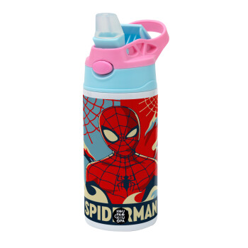 Spiderman kid, Children's hot water bottle, stainless steel, with safety straw, Pink/BlueCiel (360ml) BPA FREE