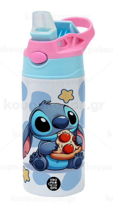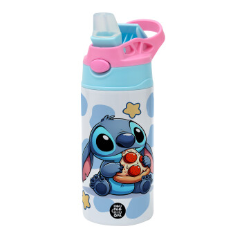 Stitch Pizza, Children's hot water bottle, stainless steel, with safety straw, Pink/BlueCiel (360ml) BPA FREE