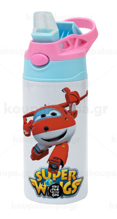 Super Wings, Children's hot water bottle, stainless steel, with safety straw, Pink/BlueCiel (360ml) BPA FREE