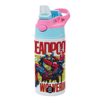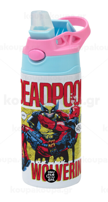 Superhero Deadpool Wolverine, Children's hot water bottle, stainless steel, with safety straw, Pink/BlueCiel (360ml) BPA FREE