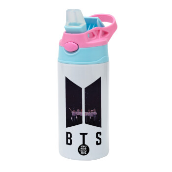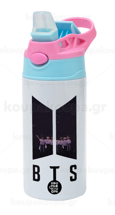 BTS, Children's hot water bottle, stainless steel, with safety straw, Pink/BlueCiel (360ml) BPA FREE