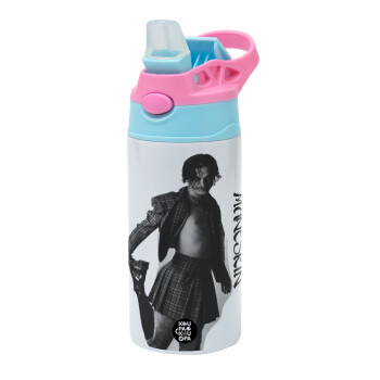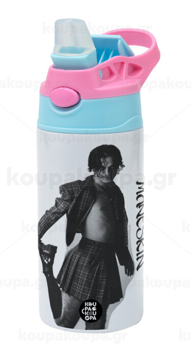 Maneskin Damiano David, Children's hot water bottle, stainless steel, with safety straw, Pink/BlueCiel (360ml) BPA FREE