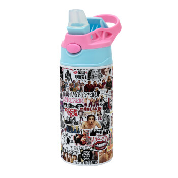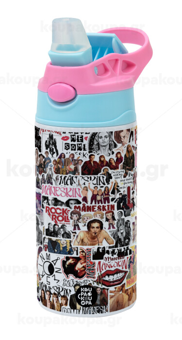 Maneskin stickers, Children's hot water bottle, stainless steel, with safety straw, Pink/BlueCiel (360ml) BPA FREE