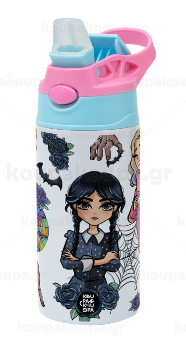 Wednesday and Enid Sinclair, Children's hot water bottle, stainless steel, with safety straw, Pink/BlueCiel (360ml) BPA FREE