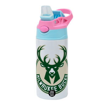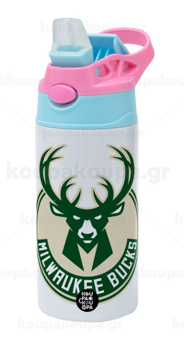 Milwaukee bucks, Children's hot water bottle, stainless steel, with safety straw, Pink/BlueCiel (360ml) BPA FREE