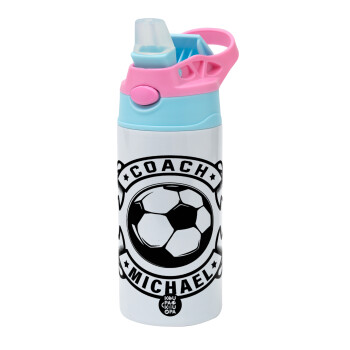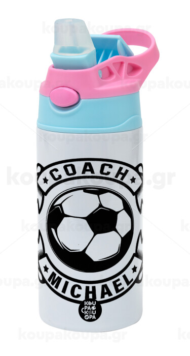 Soccer coach, Children's hot water bottle, stainless steel, with safety straw, Pink/BlueCiel (360ml) BPA FREE