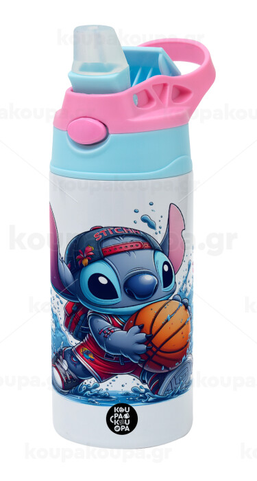 Stitch Basketball, Children's hot water bottle, stainless steel, with safety straw, Pink/BlueCiel (360ml) BPA FREE
