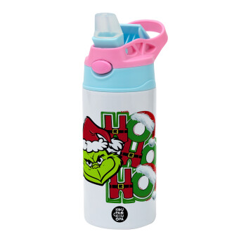 Grinch ho ho ho, Children's hot water bottle, stainless steel, with safety straw, Pink/BlueCiel (360ml) BPA FREE