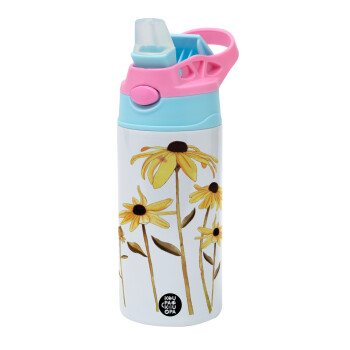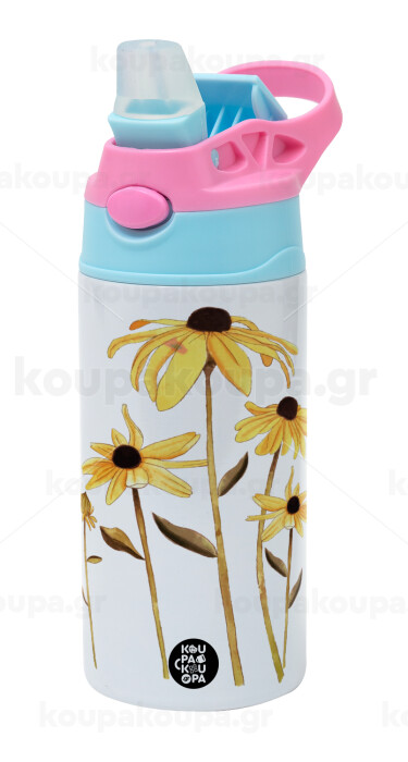 Daisies flower, Children's hot water bottle, stainless steel, with safety straw, Pink/BlueCiel (360ml) BPA FREE